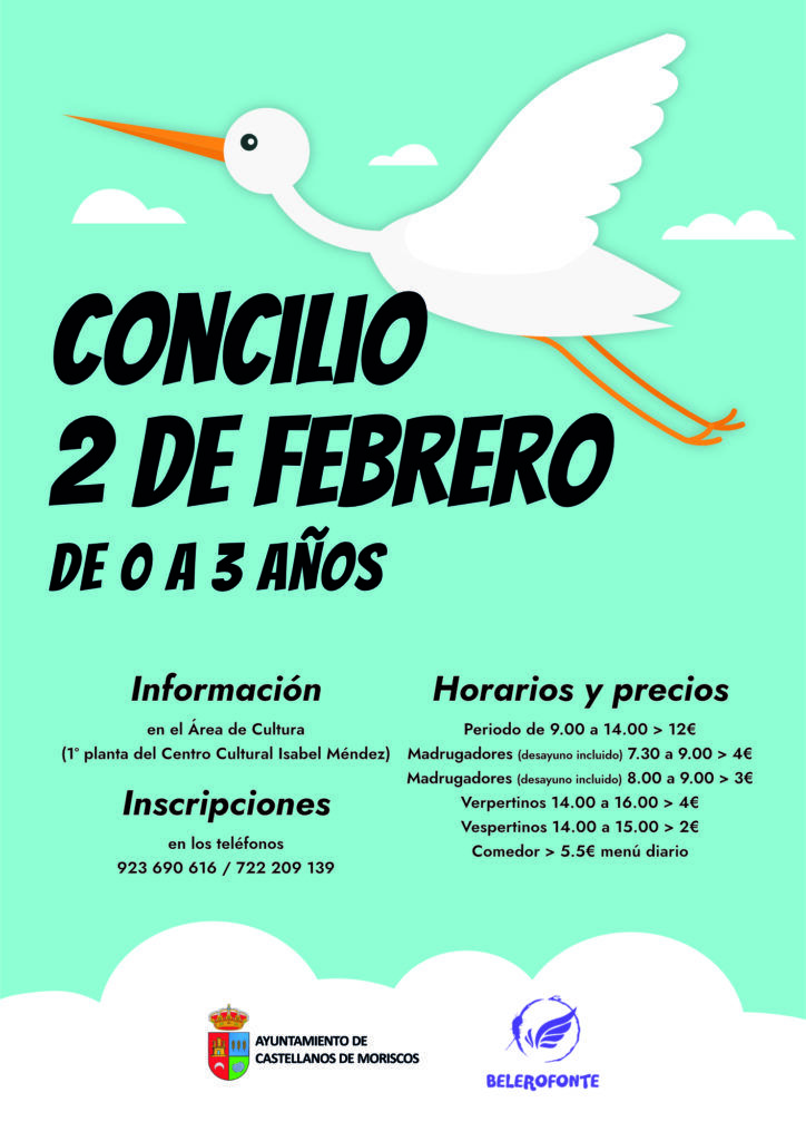 El Ayuntamiento de Castellanos de Moriscos junto con Belerofonte, para favorecer la conciliación laboral y familiar del día no lectivo, lunes 2 de febrero,  ofrecen el servicio de Guardería de 4 a 36 meses.